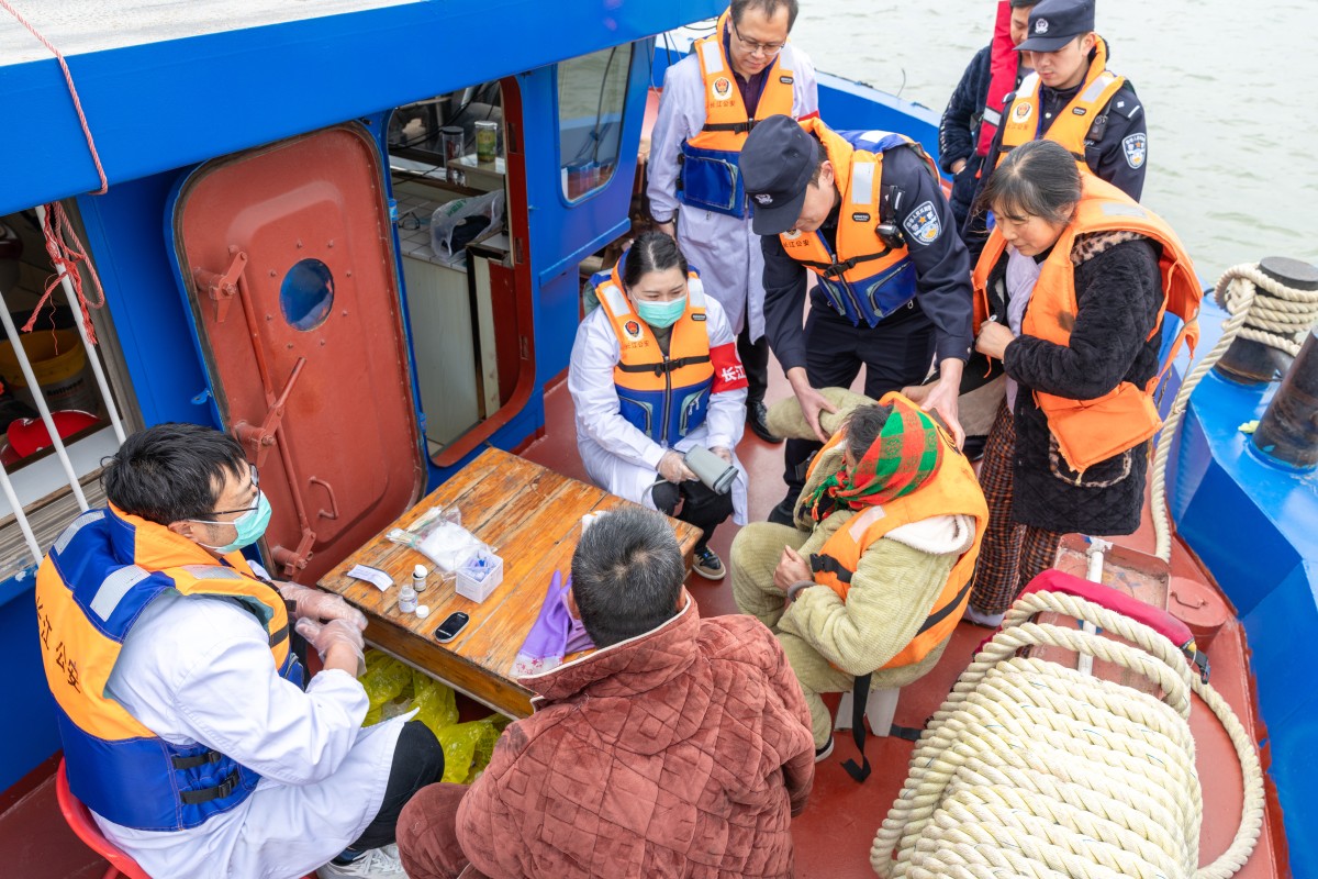 1月29日,长航公安局镇江分局镇江派出所联合镇江市第一人民医院经开分院,组织“长江义警”中的医护力量,在长江镇江段经开区水域开展“船头义诊”活动,为常年在水上作业的船民提供健康检查、疾病咨询等服务。濮方杰 摄