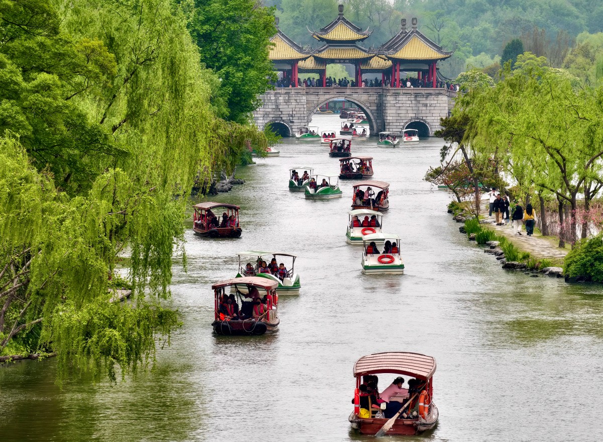 4月11日、12日,扬州景区面向持当轮扬州主场球票票根的球迷,实行全市国有收费景区日间免费入园政策,同时发布“景区+住宿+餐饮+购物”等多重优惠福利,吸引游客来扬享受精致慢生活。图为4月11日,大批游客沉浸在扬州瘦西湖中欣赏春景。余萍 摄