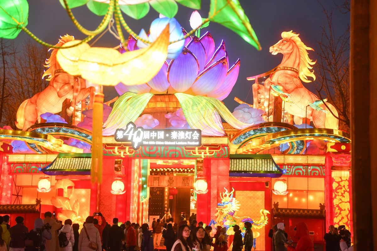 本届灯会以夫子庙核心景区、老门东街区、白鹭洲公园为重点布展范围,同时在南部新城、桥北商圈设立分会场,共设置8个展区约390组灯。图为夫子庙核心展区棂星门大型主题灯组,作为核心展区的“门面担当”,它以“盛世祥和·华彩中国年”为主题,融合了传统工艺和现代科技,规模宏大、色彩艳丽,是秦淮灯会的标志性景观。邵丹 摄