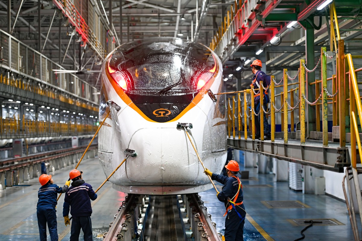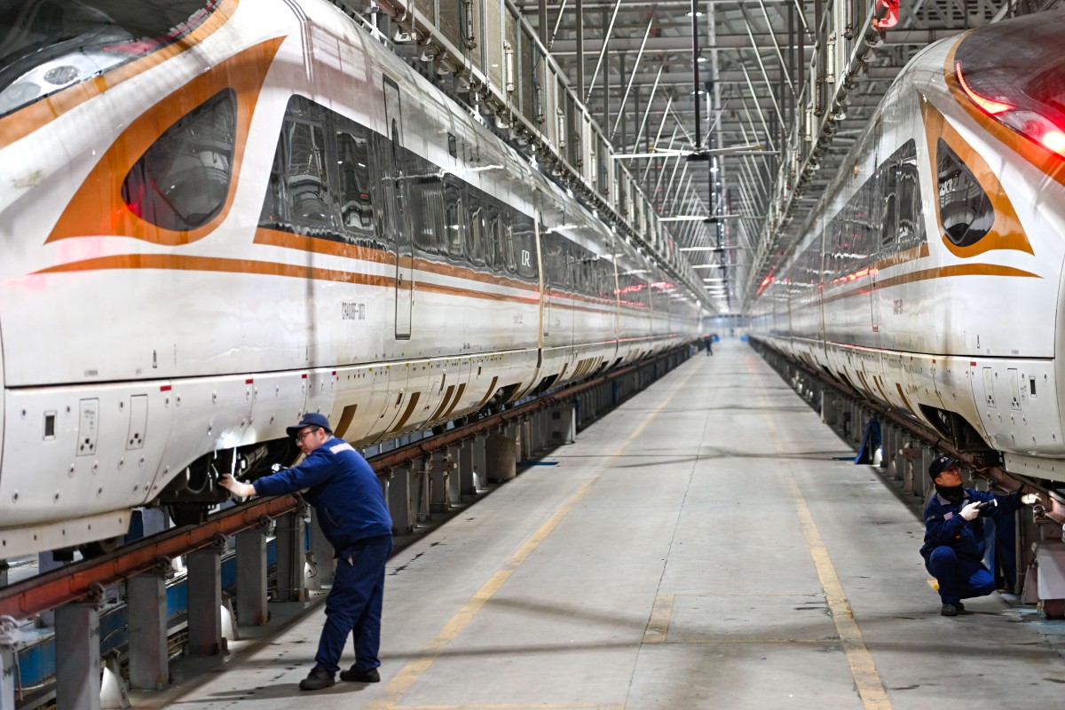 图为1月27日,工作人员在南京南动车运用所检修车间检修动车组列车。杨素平 摄